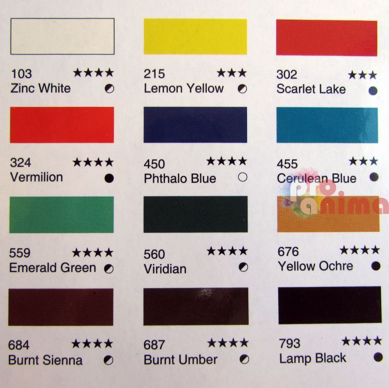 Маслените бои са произведени от най-качествените пигменти и масла. Имат добра покривност и много гладка косистенция. Комплектът съдържа следните цветове: