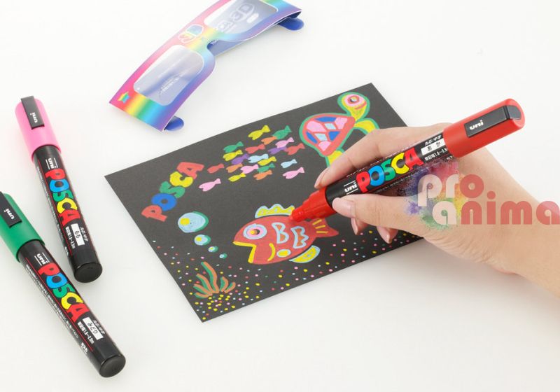 Комплект акрилни маркери Posca PC-5 M и очила, с които може да разглеждате Вашите завършени произведения (картини, рисунки, надписи и др.) в 3D ефект. За да получите 3D ефектът трябва да рисувате върху черен или тъмен фон.