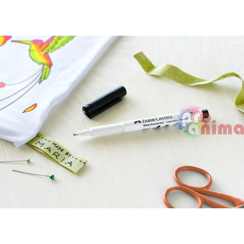 С черния маркер за текстил Faber- Castell Laundry, лесно и трайно можете да персонализирате любимите си дрехи, обувки и аксесоари. Подходящ е и за надписване на облекла в детски градини, училища, обществени перални или клиники, както и за надписване на всичко важно: име, отдел, екип и др.