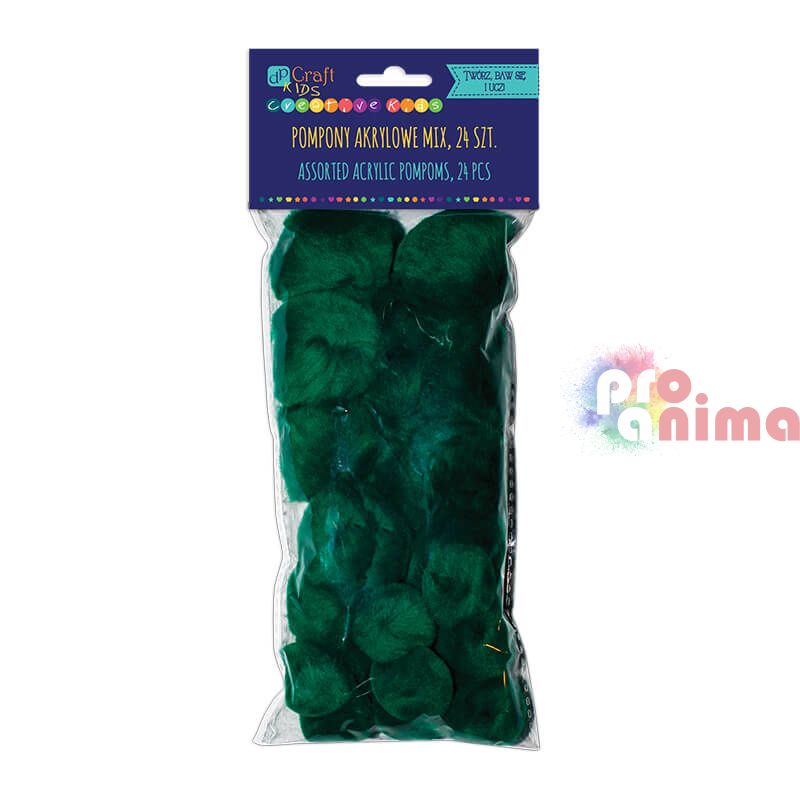 Пухкави и меки декоративни помпони от полиестер в тъмнозелен цвят. Подходящи за изработка на картички, скрабук (албуми), подаръчни опаковки и много други. Също така биха могли да се превърнат в изключително забавно занимание за Вашето дете - направа на животни, хора и други създания.