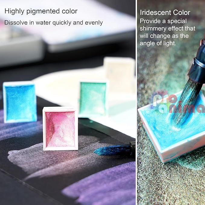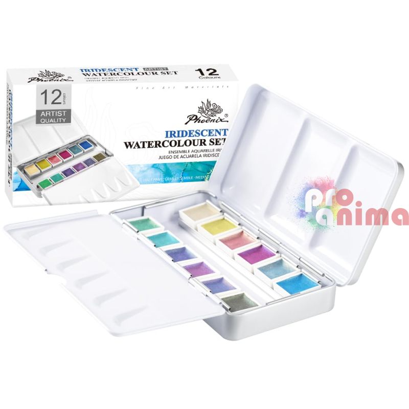 Комплектът акварелни бои Phoenix в 12 преливащи се цвята с блестящи нюанси са подходящи за студенти, начинаещи и напреднали творци. Чудесната палитра от цветове, характеризираща се с деликатна прозрачност, е постигната с висококачествени пигменти и добавки. С акварелните бои в преливащи се цветове Phoenix, ще придадете блестящ ефект на Вашите произведения, който се променя с ъгъла на светлината.