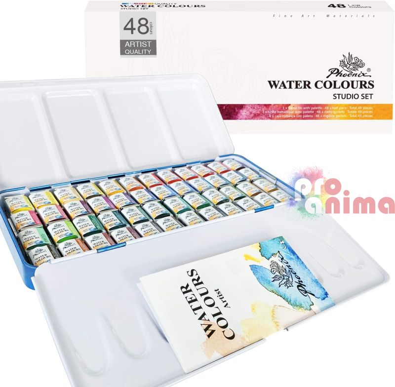 Комплектът акварелни бои Phoenix 48 цвята подходящи за студенти, начинаещи и напреднали творци. Чудесната палитра от цветове е постигната с висококачествени пигменти и добавки. Акварелната боя Phoenix се отличава с по-мек цвят и с по-висока адхезия върху хартията.