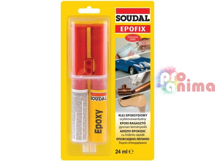 Двукомпонентно епоксидно лепило SOUDAL Epofix лепи и възстановя широка гама от продукти. Лепилото изсъхва бързо, като образува изключително здрава лепилна връзка, която е устойчива на вода, разтворители и физическо натоварване. След втвърдяване епоксидното лепило SOUDAL Epifix може да се шкури, полира, пробива, обработва машинно и боядисва. Подходящо е за употреба на открито и закрито.