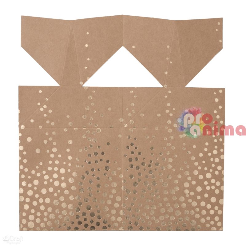 Сгъваема кутия (куб) от крафт картон на златни точки, подходяща за опаковане на подаръци за различни поводи- коледни или великденски празници, рожден ден, сватба и др. В комплекта се съдържат и 2 бр. златисти панделки за завързване на горната част на кутията.