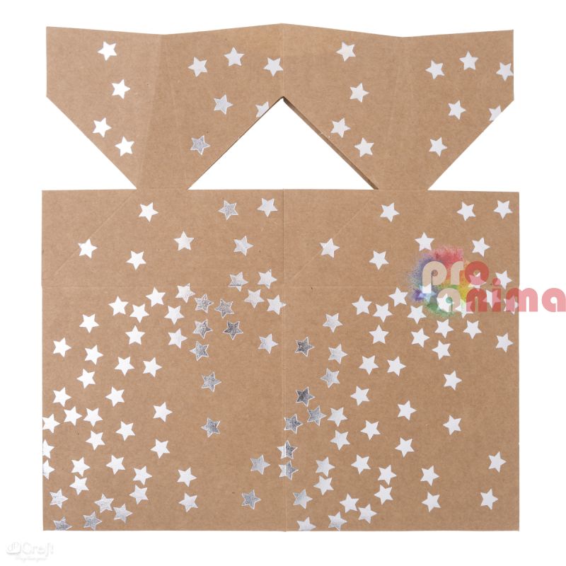 Сгъваема кутия (куб) от крафт картон на сребърни звездички, подходяща за опаковане на подаръци за различни поводи- коледни или великденски празници, рожден ден, сватба и др. В комплекта се съдържат и 2 бр. златисти панделки за завързване на горната част на кутията.