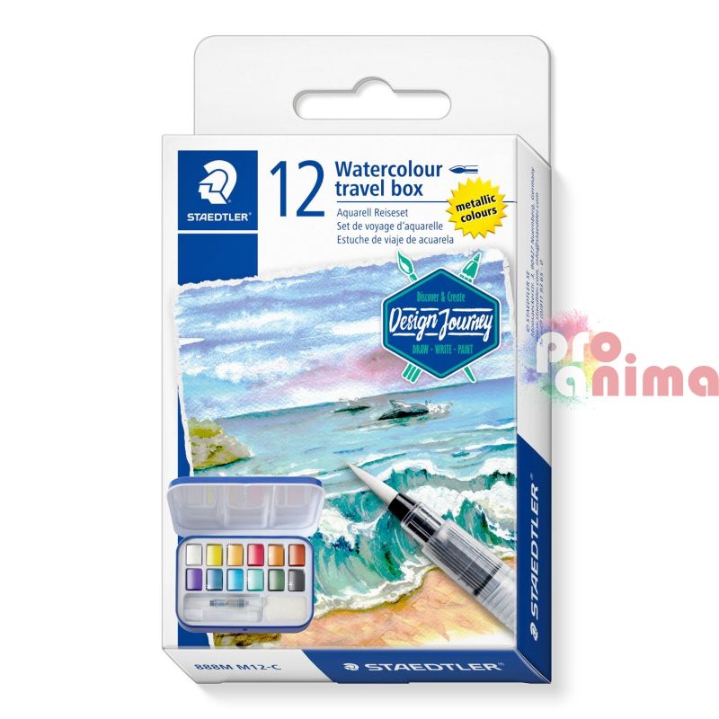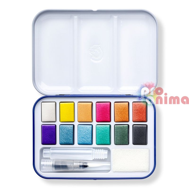 Комплект акварелни бои Staedtler Design Journey, 12 металик цвята, в метална кутия + четка с резервоар