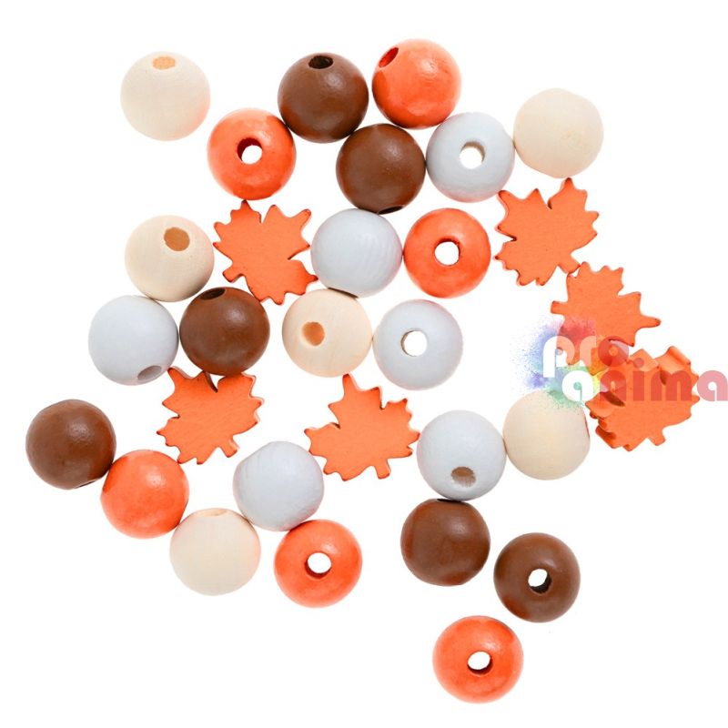 - Комплектът включва 30 бр. дървени мъниста: топчета и листа;