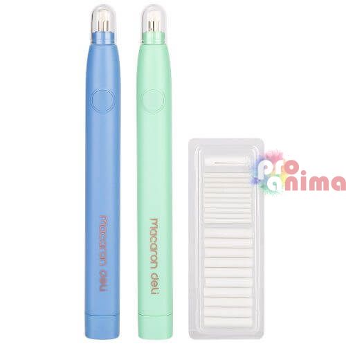 Електрическата гума Deli Macaron изтрива лесно и бързо чернографитни моливи, може да се използва за постигане на отблясъци. Незаменима е при работа с прецизни детайли. Електрическата острилка Deli вибрира съвсем леко, без да има нужда от триене, като предпазва хартията от нараняване.