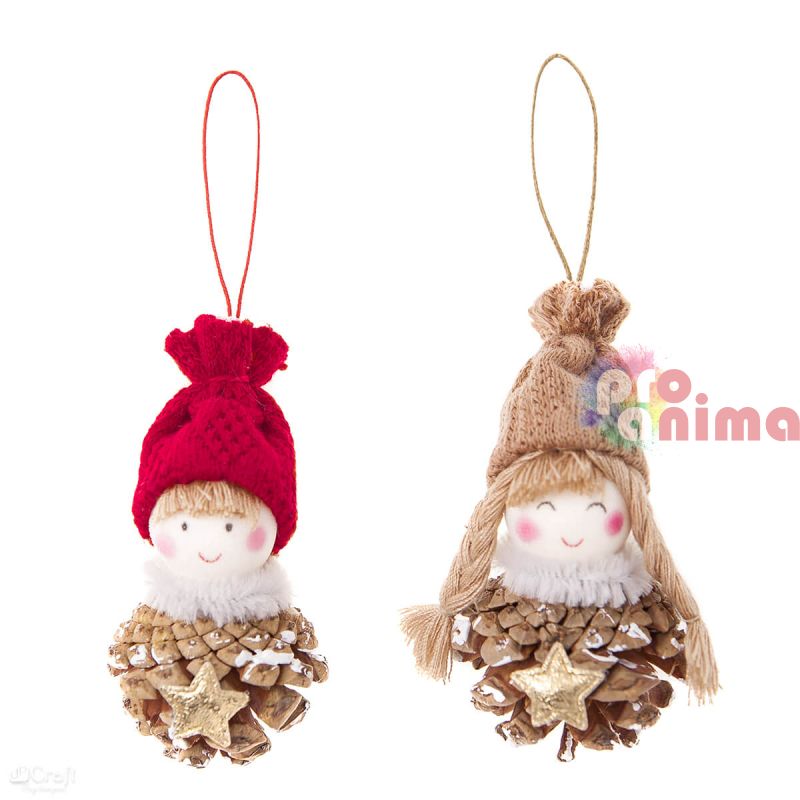 Декоративните висулки кукли на момченце и момиченце от DP Craft са чудесно допълнение към коледната Ви декорацията. Висулките ангелчета са подходящи за коледна елха, венец или чудесна целогодишна декорация в стаята на Вашето дете. Основата на висулките са шишарки, декорирани с бяла боя и златни звездички. Кукличте са допълнително декорирани с плетени шапки в бял и червен цвят и шалчета от пухкава декоративна тел.