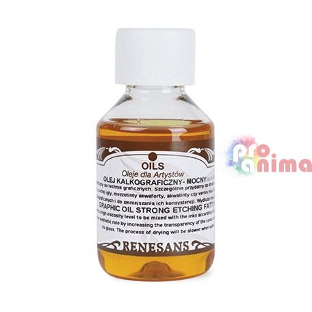 Калкографското силно масло за графични техники от Renesans се използва за смесване с калкографски мастила (печатни мастила), като ги разрежда и намалява консистенцията им.