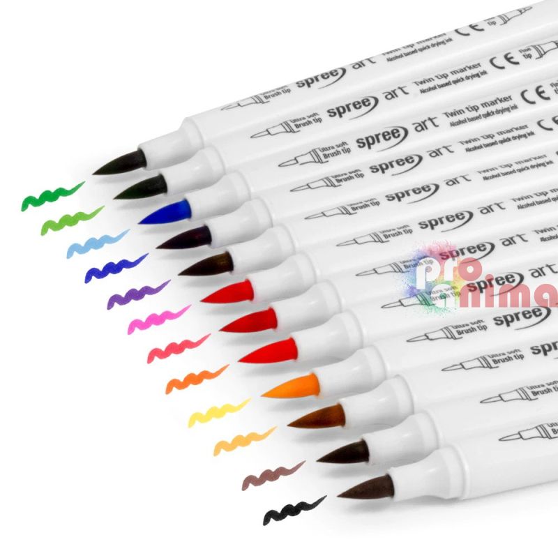 Двувърхи маркери Spree подходящи за рисуване на фини линии, за създаване на цветни преливки, за щриховане и светлосенки, за запълване на очертания.