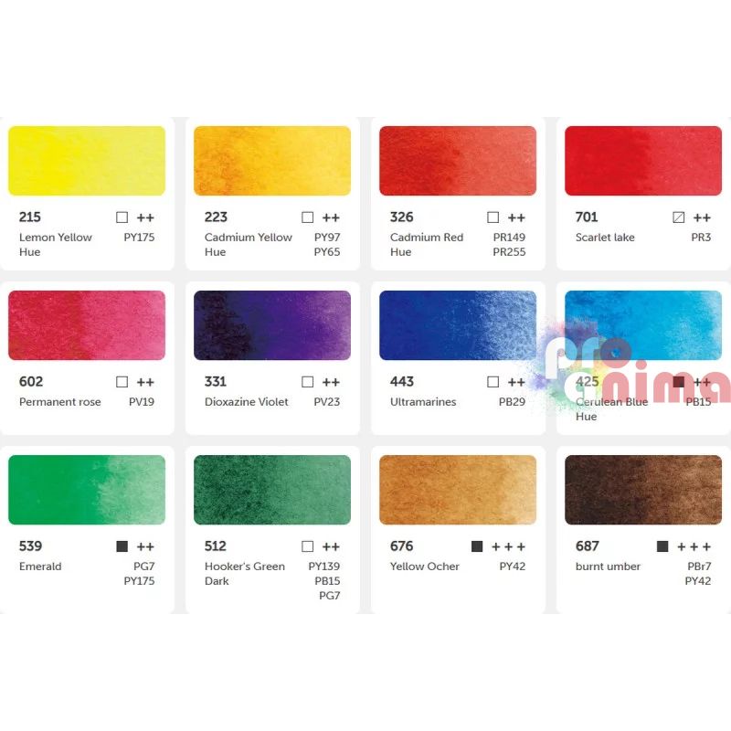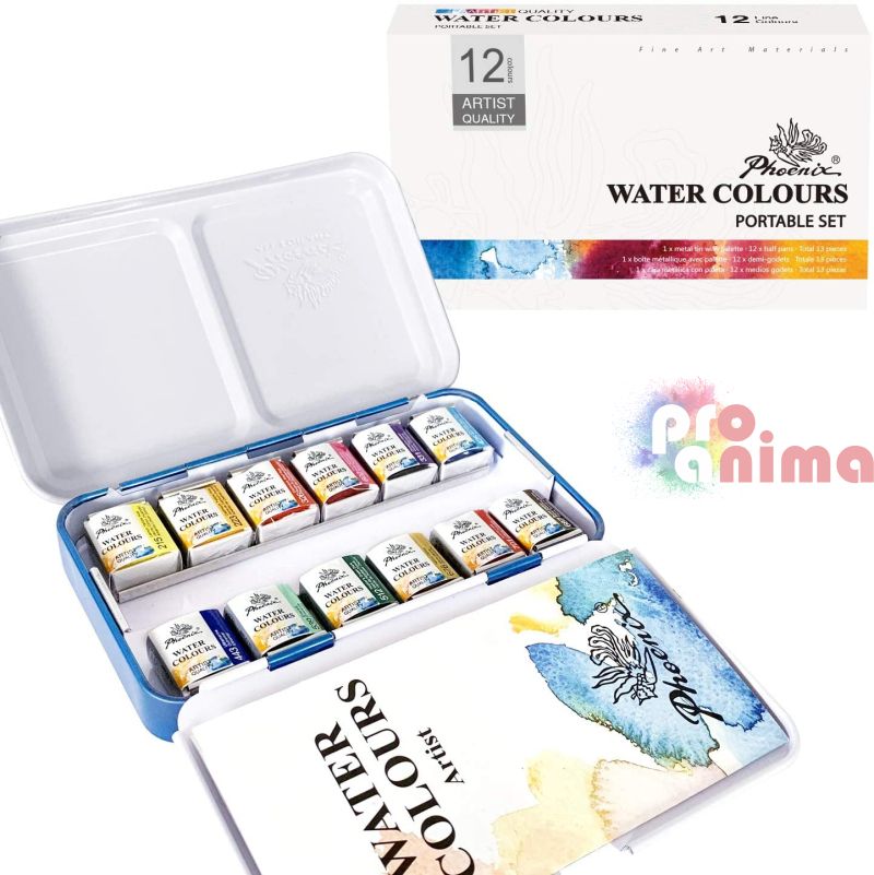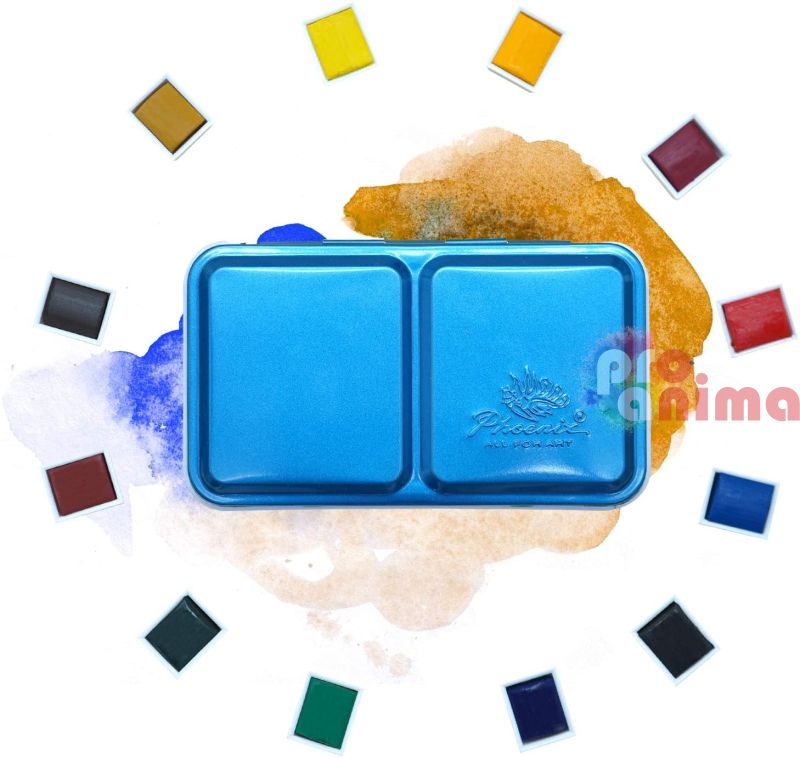 Комплектът акварелни бои Phoenix 12 цвята подходящи за студенти, начинаещи и напреднали творци. Чудесната палитра от цветове е постигната с висококачествени пигменти и добавки. Акварелната боя Phoenix се отличава с по-мек цвят и с по-висока адхезия върху хартията.