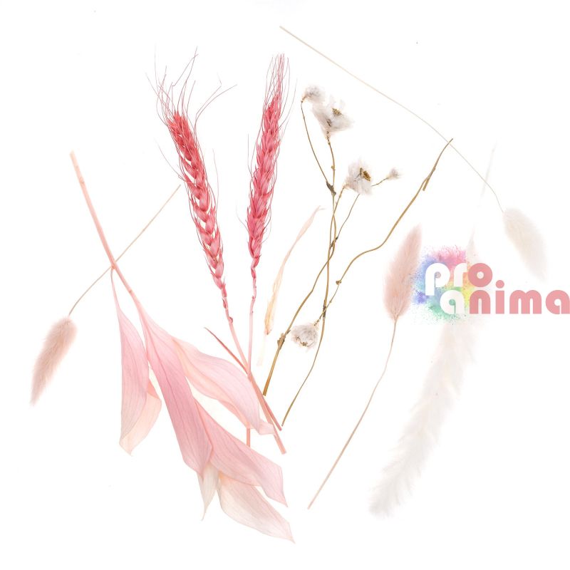 - мини букетът от сухи цветя в розово Misty Pink включва: листенца в розово, бяла пампас трева, бяла маргаритка, бял и розов лагурус и др.;