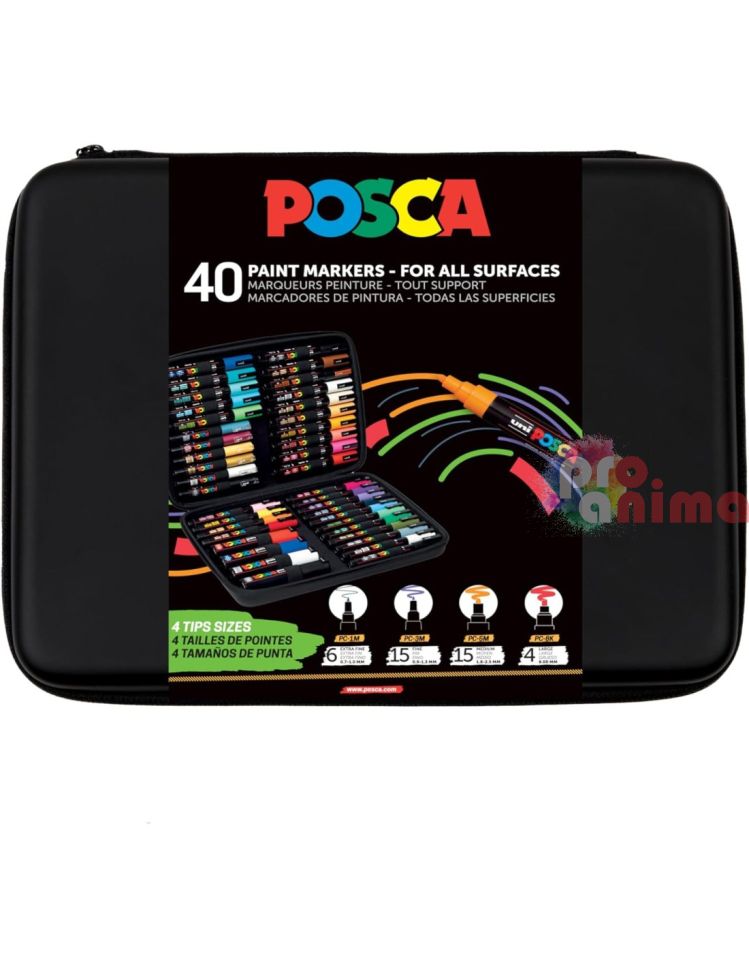 Комплект акрилни маркери POSCA 40 цвятa в голям несесер, подходящи за рисуване върху стъкло, метал, дърво, хартия, текстил, керамика, пластмаса, плат и др.