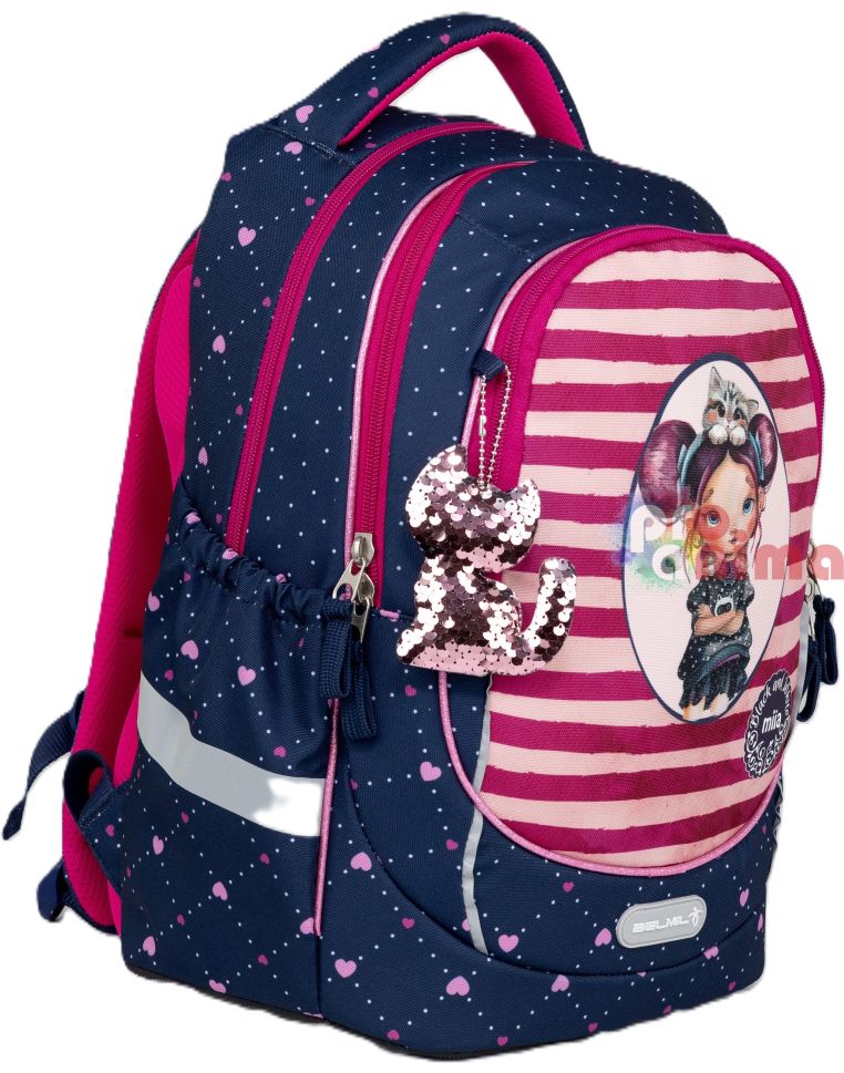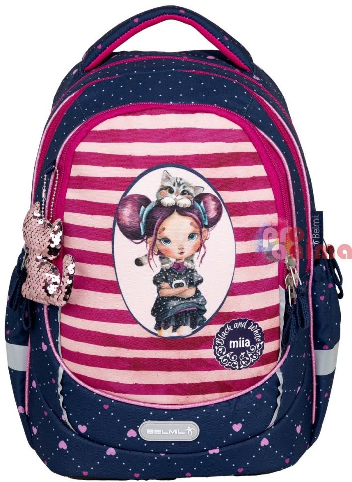 Ученическите раници Belmil се отличават със своя изключителен комфорт, съчетан с високо качество на използваните материали. Раницата за училище Belmil Miia 2 е от най-популярните и търсени модели раници на производителя, поради практичност, ергономичност и страхотен дизайн. Ексклузивна лимитирана серия на българската илюстраторка Ивайла Стоева (Miia). Тежи само 700-750 г.