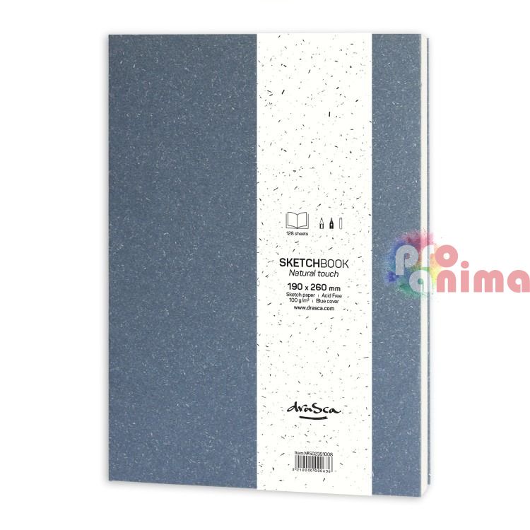 Скицникът Natural Touch в син цвят е облечен с мека корица от грапав картон с натурална визия. Скицникът е подходящ за рисуване с графит, въглен, креда, туш, тънкописци, маркери, моливи, сух и восъчен пастел. Съдържа 128 листа хартия за скици с леко кремав цвят, обработена без киселина. Скицникът е съставен от 16 тетрадки по 8 листа, които са подшити помежду си за по-голяма здравина.