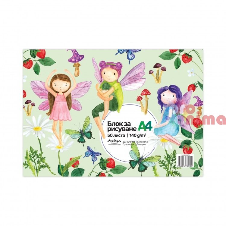 Скицник за рисуване Drasca Kids World, А4, 140 g/m2, 50 листа, лепен, Феи