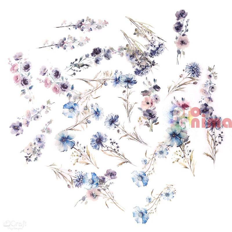 - В комплекта са включени: далии, сини макове, анемонии, метличини и глухарчета с нежни клонки, в приглушени сини тонове;