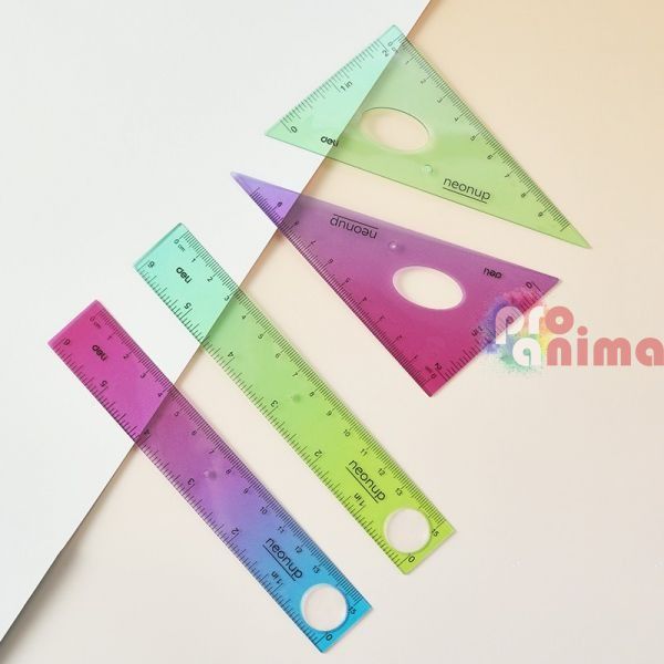 Чертожен комплект Deli Neonup- линия, 2 триъгълника и транспортир, цветни