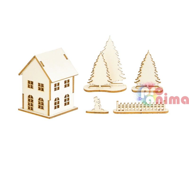 Креативен комплект за декорация Дървена къща, елхи и снежен човек, за сглобяване, 16 части
