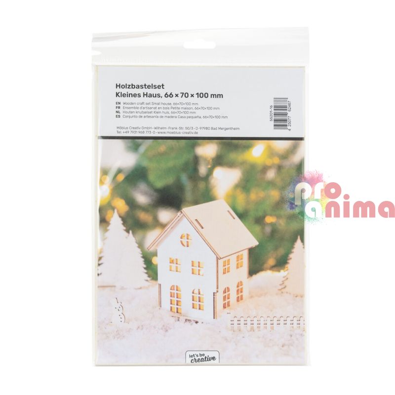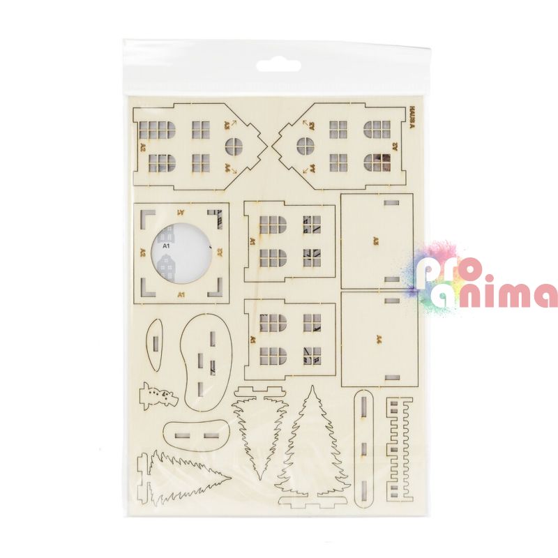 Комплектът от фигури от дърво- къщичка, елхи и снежен човек, ще внесе празнично настроение в класната стая, в офиса, магазина или у дома, при използването в различни декорации, за украса на витрини или събития.