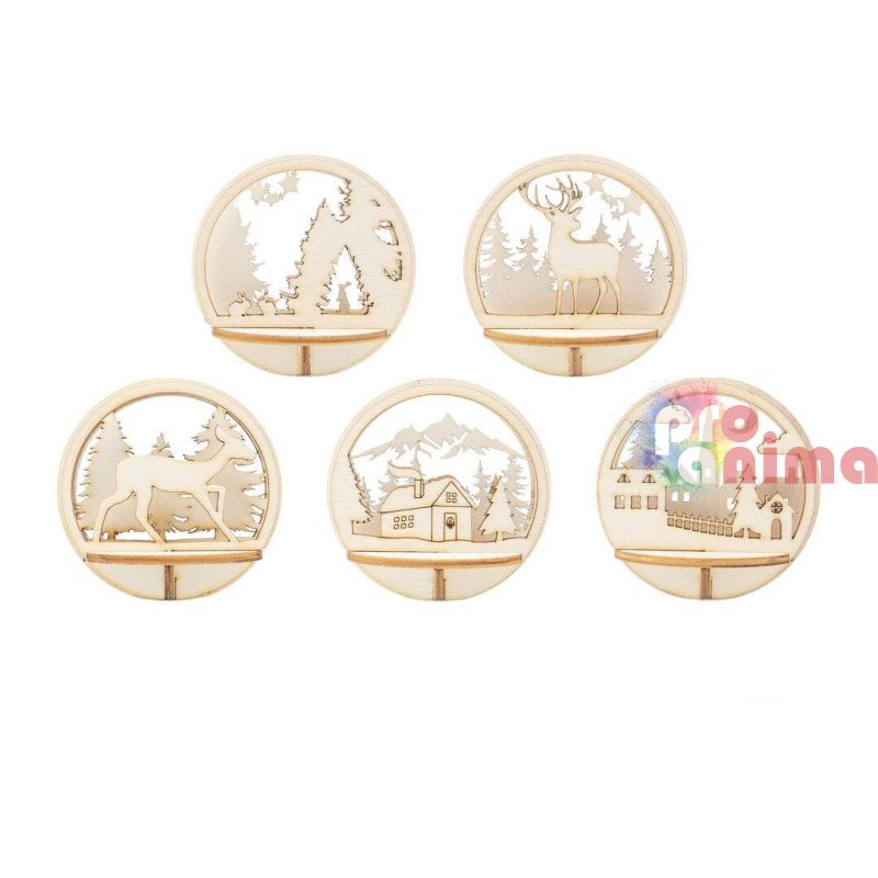 Комплект дървени фигури за прозрачни топки, ф7.4 cm, 5 мотива, Гора