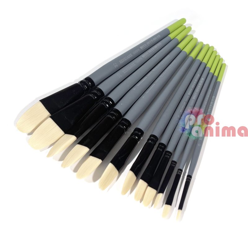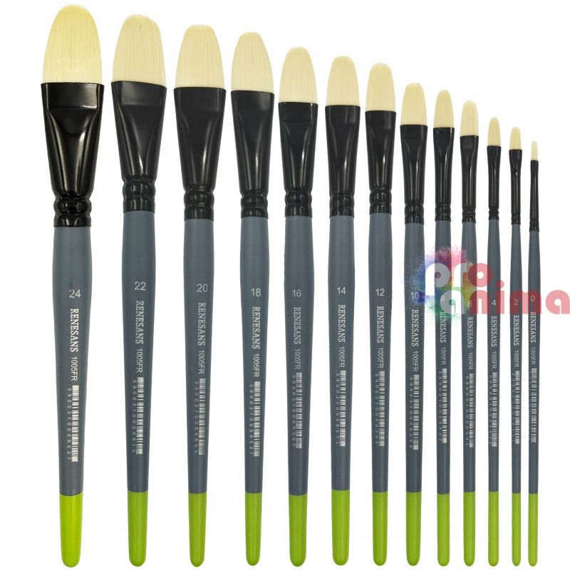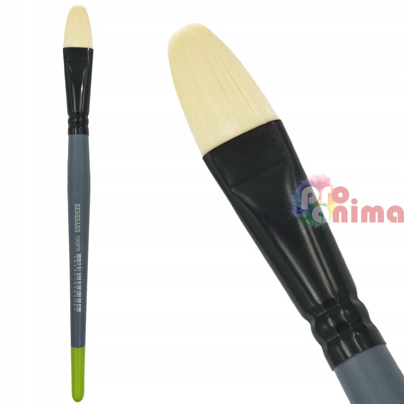 Четките с лешниковиден връх от серията на Renesans 1005FR са изработени от устойчиви на разтворители синтетични влакна, имитация на четина, което ги прави подходящи за рисуване с всякакви бои (акрилни, маслени, бои на алкохолна основа, мастила и др.). Четките са лесни за почистване и изключително дълготрайни, дори когато се използват върху по-груби повърхности. Дървената, ергономично оформена дръжка в сиво покритие с лимоновозелен завършек, осигурява лесна употреба и след дълги часове пред статива.