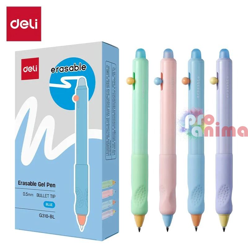Изтриваема химикалка Deli EG310-BL с тънък връх 0.5 mm и наситено синьо мастило, което лесно се изтрива.