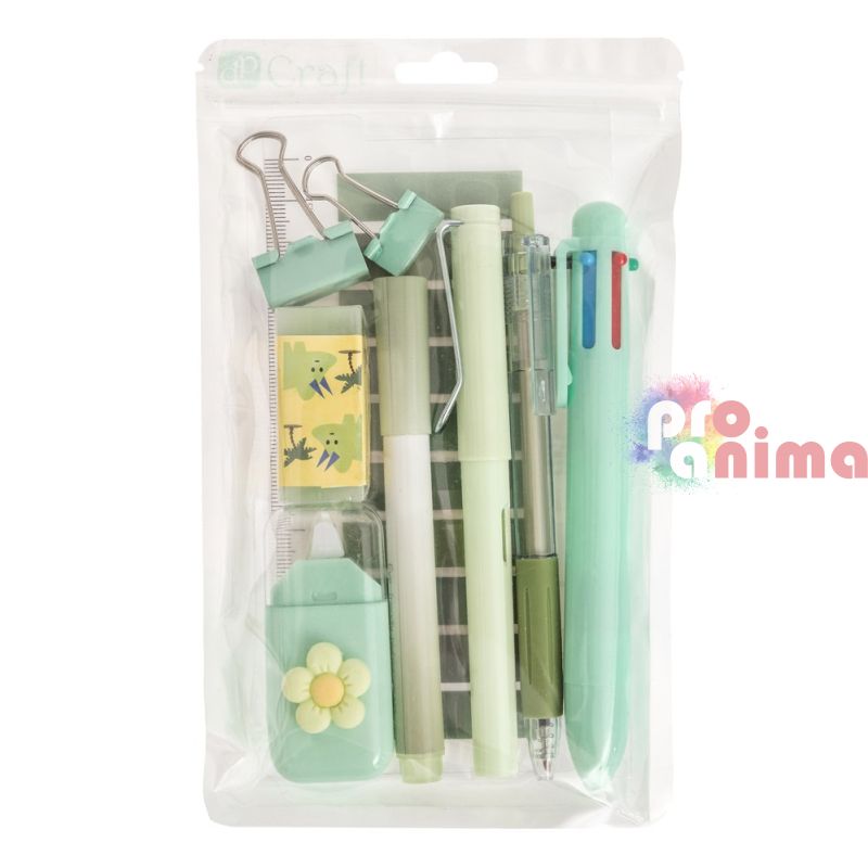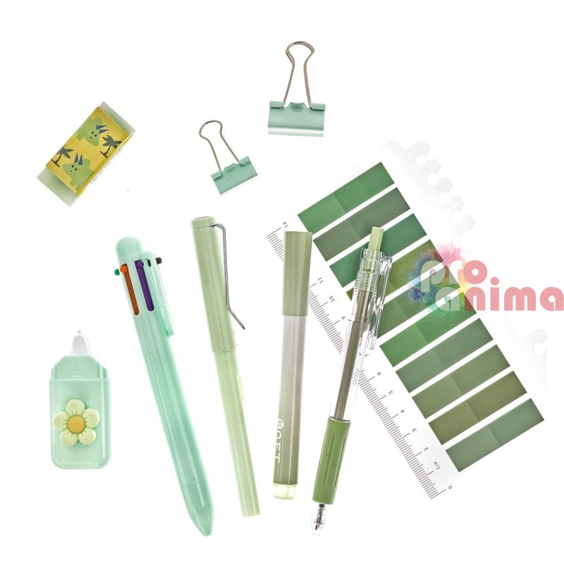 Стилен и практичен комплект от 9 бр. основни пособия в пастелно зелен цвят, подходящ за училище, офис, университет или домашно бюро. Аксесоарите са леки, удобни и практични за ежедневна употреба.