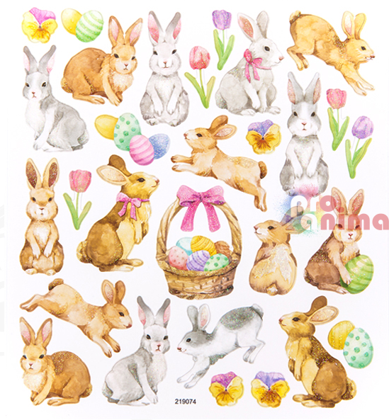Цветни глитер стикери (с блестящ ефект) във формата на великденски зайчета. Чудесни са за изработка на картички, скрапбук албуми, домашен декор, подаръчни опаковки, детски творчески дейности и много други.