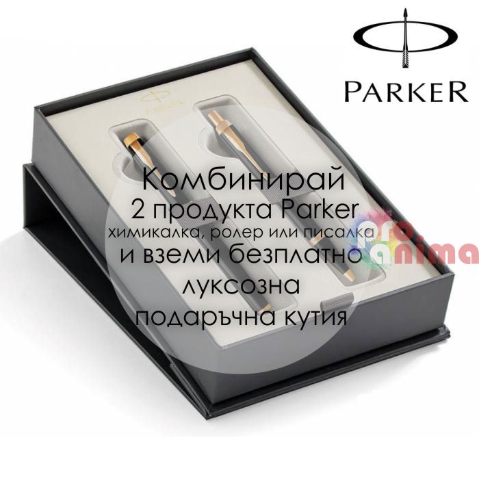 Вземи я в комплект с ролер или химикалка Parker от същата серия и ще получиш двата продукта в безплатна луксозна подаръчна кутия. Ако пък искаш да добавиш към писалката тефтер Parker избери от опциите на продукта: в подаръчна кутия с тефтер.