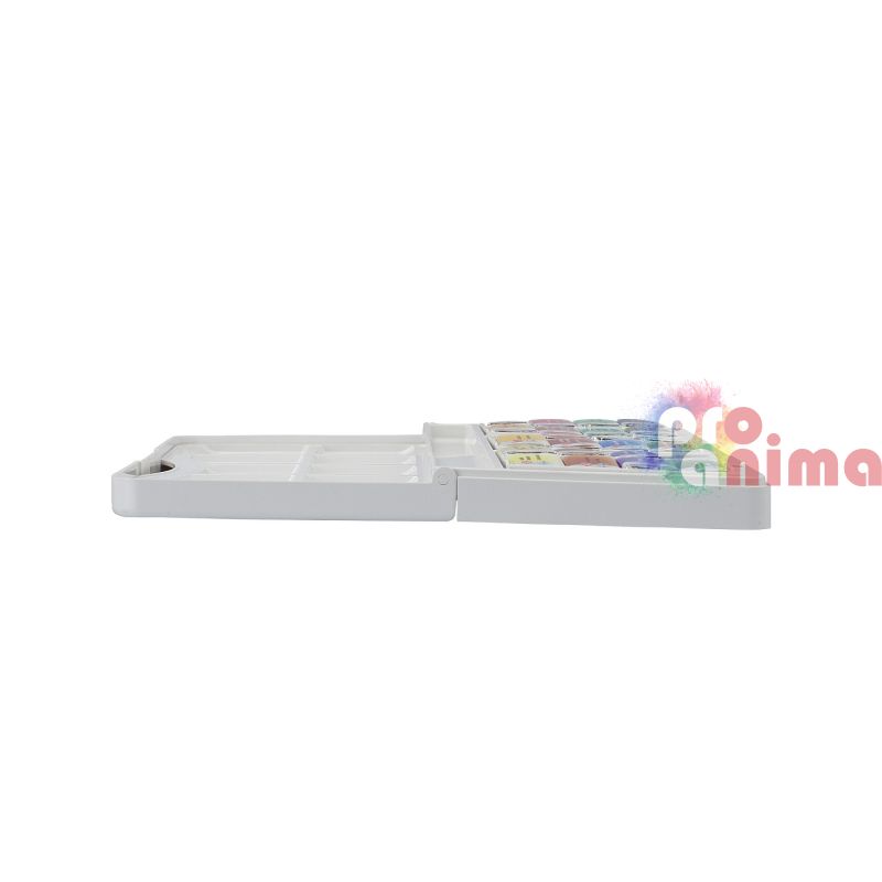 Опаковката на боите е от пластмаса, като капакът се разглобява и би могъл да се използва за палитра.