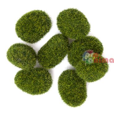 Декоративните камъчета, покрити с изкуствен мъх, са оригинално допълнение към проекти за домашен декор и флористични композиции. Те изглеждат чудесно в стъклен съд, на витрина или като декорация за сватбени тържества с горска тематика.