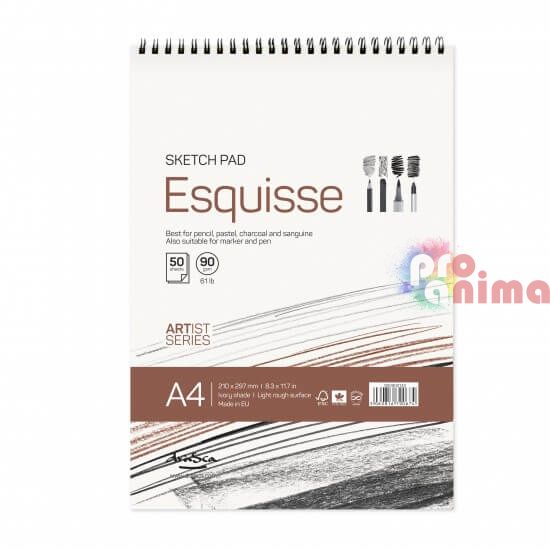 Еsquisse във формат А4 е лек и удобен скицник със спирала на късата страна, което позволява отварянето му на 360 градуса. Скицникът е подходящ за рисуване с моливи, пастели и въглен, маркери, тънкописци. Гърбът от мукава би могъл да служи за твърда основа при рисуване.