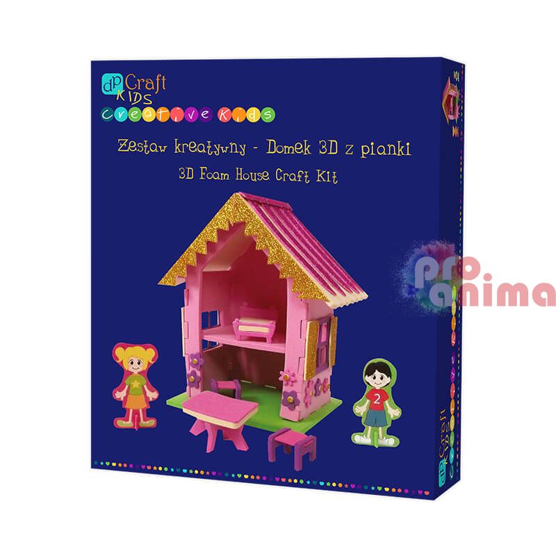 Креативен комплект, с който без рязане и лепене можете да създадете просторна къща за кукли от foam (гумирана пяна). Комплектът помага за развитие на творческото мислене на детето и го насърчава да се включва в различни ролеви игри. Само трябва да свържете всички елементи според инструкцията и сте готови за игра!